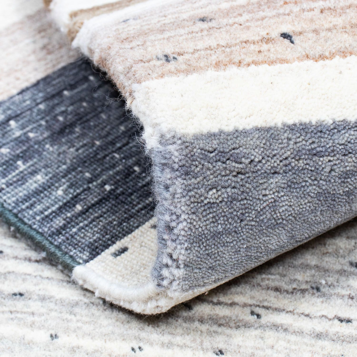 Esta alfombra está hecha exclusivamente con lana de oveja hilada a mano. Gracias a este trabajo manual, la lana conserva al máximo sus propiedades naturales: es resistente, elástica y suavemente acogedora al caminar.