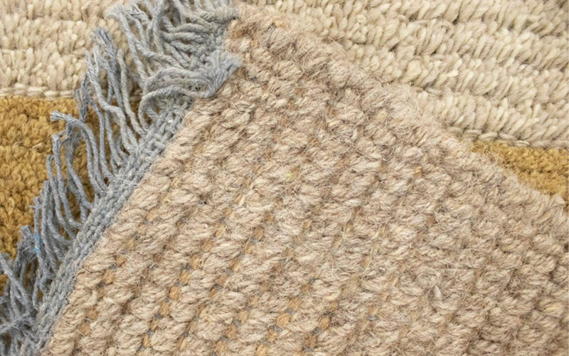 Esta alfombra está hecha exclusivamente con lana de oveja hilada a mano. Gracias a este trabajo manual, la lana conserva al máximo sus propiedades naturales: es resistente, elástica y suavemente acogedora al caminar.