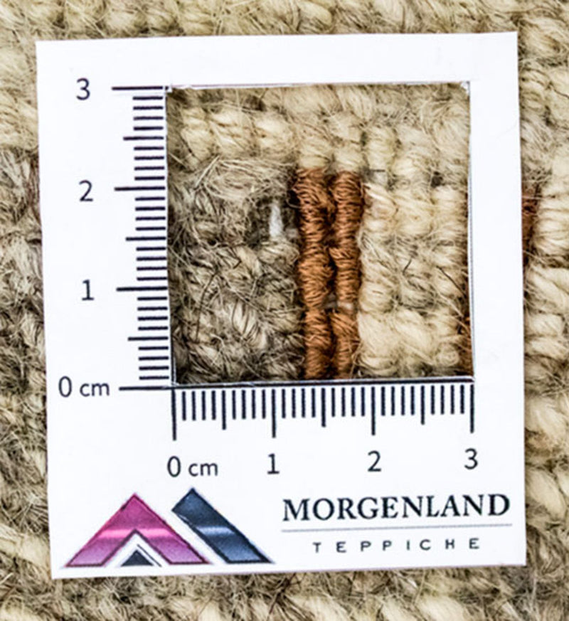 Esta alfombra está hecha exclusivamente con lana de oveja hilada a mano. Gracias a este trabajo manual, la lana conserva al máximo sus propiedades naturales: es resistente, elástica y suavemente acogedora al caminar.