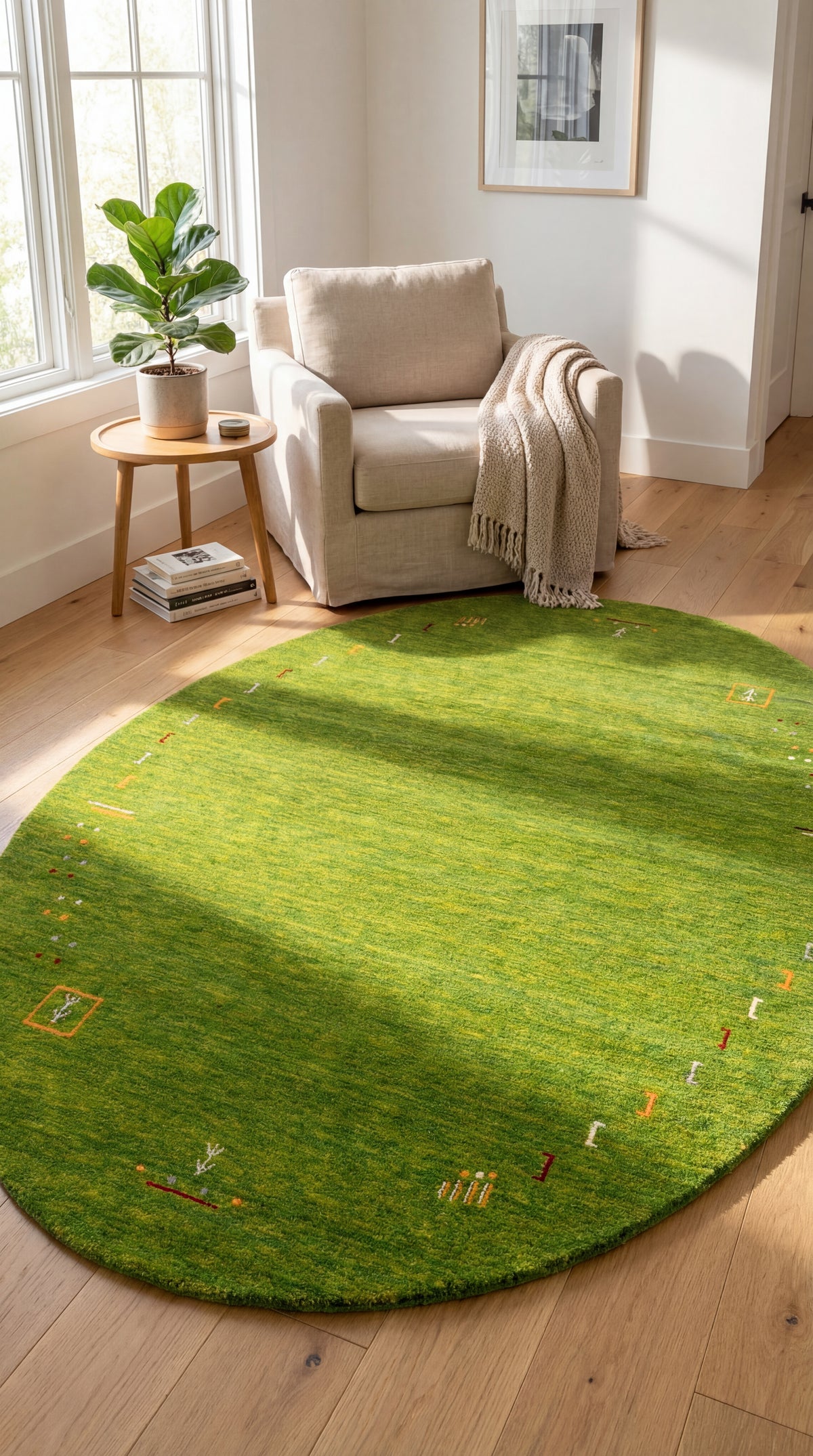 La lana hilada a mano aporta una textura única y ligeramente irregular, con un brillo sutil característico de la auténtica artesanía. Además, regula la temperatura, repele la suciedad y contribuye a un ambiente interior confortable.