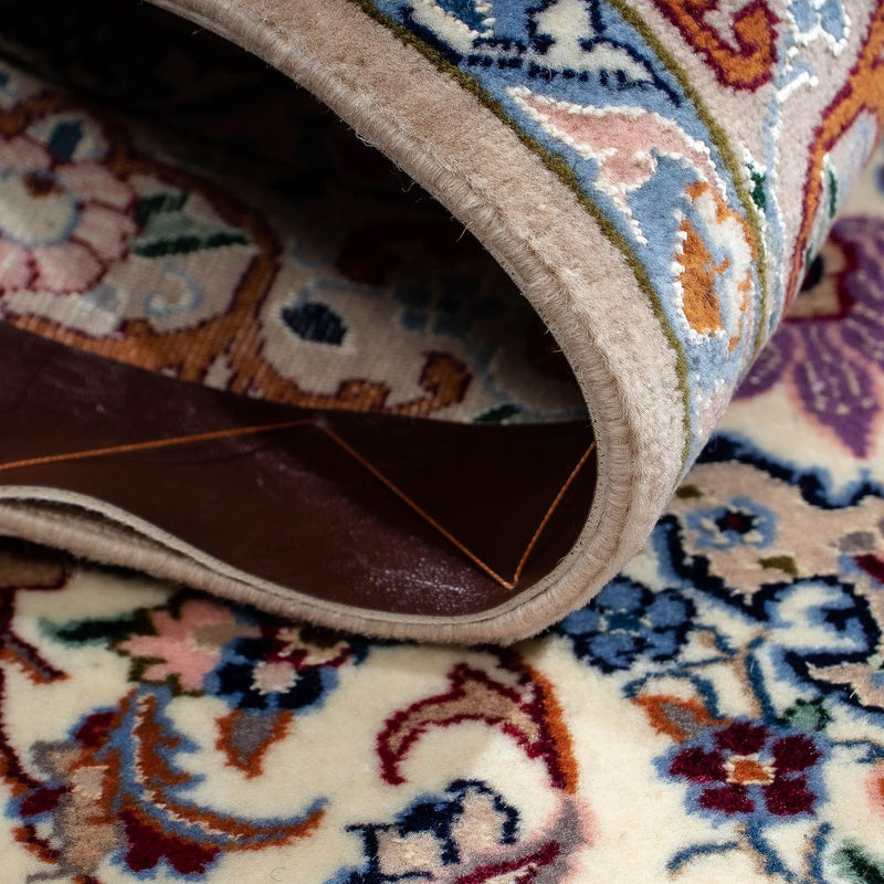 Esta alfombra persa - Isfahan - Premium lleva el lujo a su hogar. Esta alfombra está hecha 100% de seda y pertenece al nivel 4 de máxima calidad. Su densidad de nudos de aproximadamente 890.000 a 1.000.000 de nudos por metro cuadrado promete la mejor calidad y durabilidad. Las alfombras de Isfahan deben considerarse una artesanía exquisita. Isfahan es probablemente la ciudad más bella del Islam y esta alfombra es una parte importante de ella. Artísticos medallones, zonas con jarrones, pájaros o animales salvajes adornan la alfombra de Isfahan y la convierten en una de las más populares y, al mismo tiempo, en la alfombra persa de mayor calidad por su atención a los detalles, su alta densidad de nudos y su brillo sedoso. Los materiales de alta calidad son una cuestión de tradición. Por eso suele tener una urdimbre de seda. Incluso hoy, muchas alfombras de Isfahan tienen marcas anudadas en el borde. Puedes mirar una alfombra como ésta durante horas y olvidarte del tiempo, una experiencia que no se puede capturar en una foto.