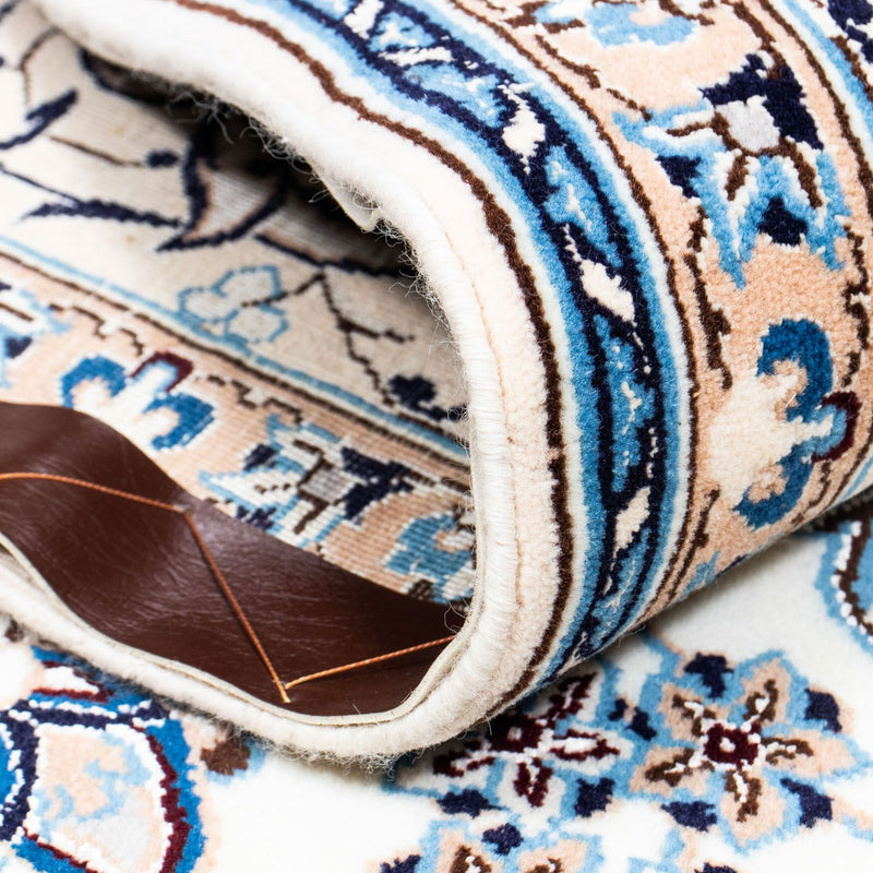Nain 9La es una alfombra finamente anudada a mano que encajará perfectamente en su hogar. Está hecha de lana de corcho y de seda, lo que hace que se sienta particularmente suave bajo los pies y crea una atmósfera de lujo con su brillo. La alfombra persa nain 9la pertenece al nivel 3 de alta calidad con aproximadamente 250.000 a 360.000 nudos por metro cuadrado.