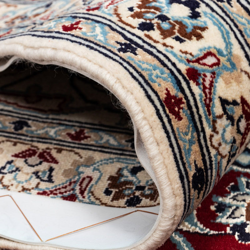 Nain 9La es una alfombra finamente anudada a mano que encajará perfectamente en su hogar. Está hecha de lana de corcho y de seda, lo que hace que se sienta particularmente suave bajo los pies y crea una atmósfera de lujo con su brillo. La alfombra persa nain 9la pertenece al nivel 3 de alta calidad con aproximadamente 250.000 a 360.000 nudos por metro cuadrado.