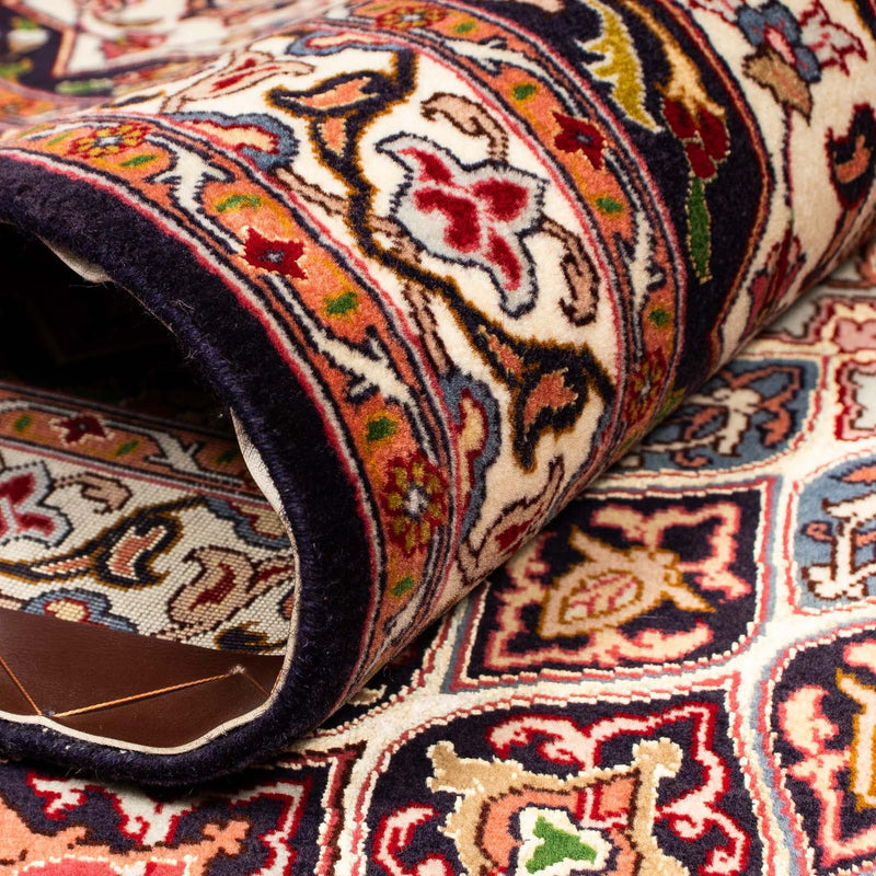 Esta alfombra persa finamente anudada - Tabriz - Royal está elaborada con lana de corcho de alta calidad, en un cuidadoso e impecable trabajo manual. El Tabriz 40 Raj es uno de los más bellos de su clase. Esta alfombra estableció la buena reputación del arte persa del anudado. Es una alfombra muy popular procedente de una de las mejores zonas de anudado de Persia. Suelen tener un gran medallón central con bellos motivos florales, un motivo típico oriental. Las alfombras de Tabriz suelen llevar la denominación adicional de Raj. Se distingue entre 40, 50, 60, 70, 80 Raj. Cuanto mayor sea el número, más fino y denso será el nudo de la alfombra. Raj es una designación de calidad y se refiere al número de nudos en un ancho de aproximadamente 70 mm. Gracias a su denso anudado, la alfombra es duradera, resistente y también muy adecuada para un uso extremo. La elegancia clásica y la riqueza del color caracterizan a esta noble alfombra.