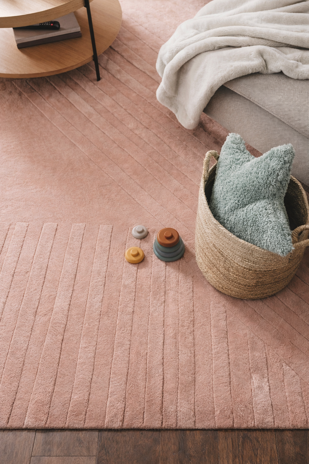 La lana hilada a mano aporta una textura única y ligeramente irregular, con un brillo sutil característico de la auténtica artesanía. Además, regula la temperatura, repele la suciedad y contribuye a un ambiente interior confortable.